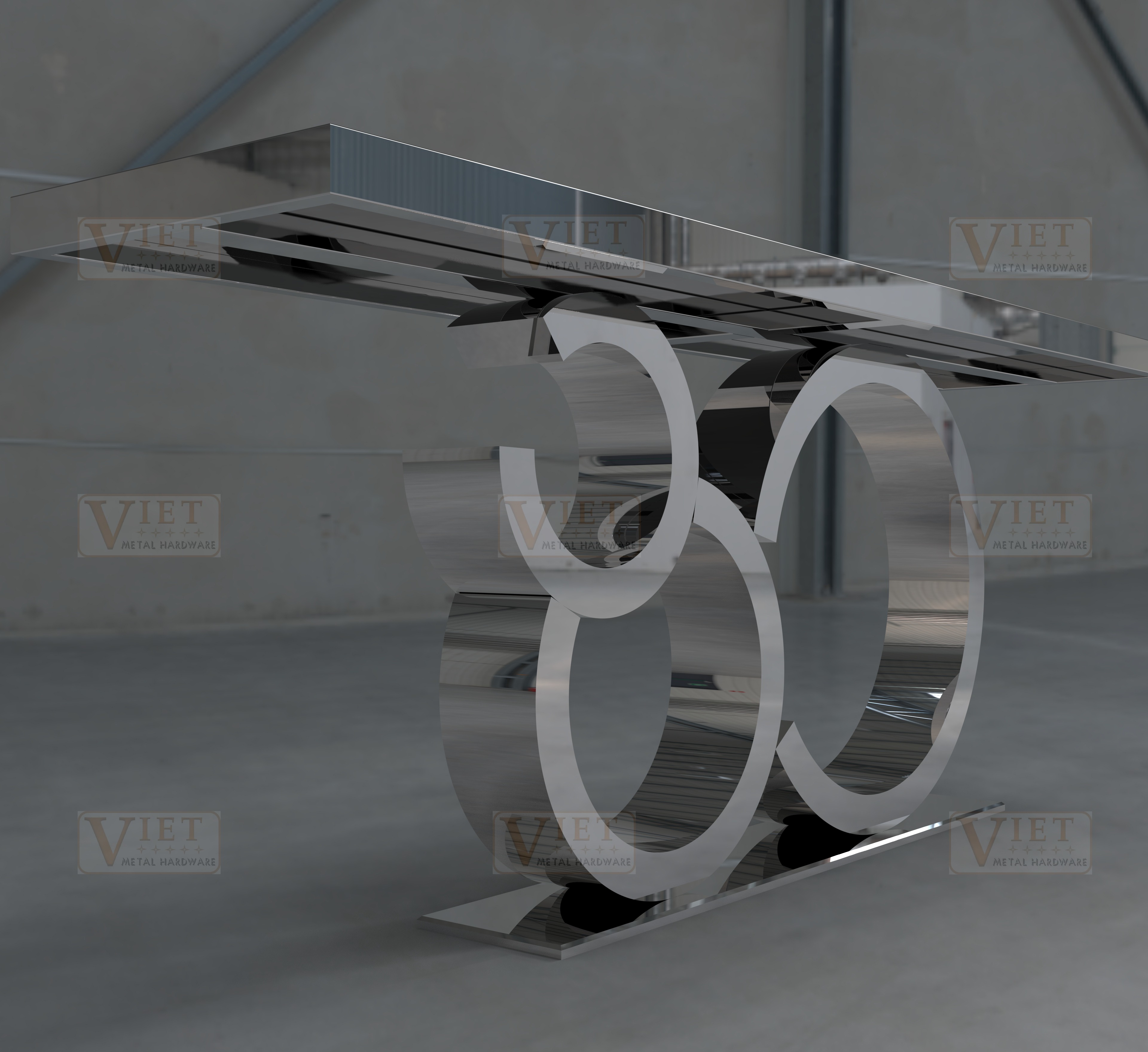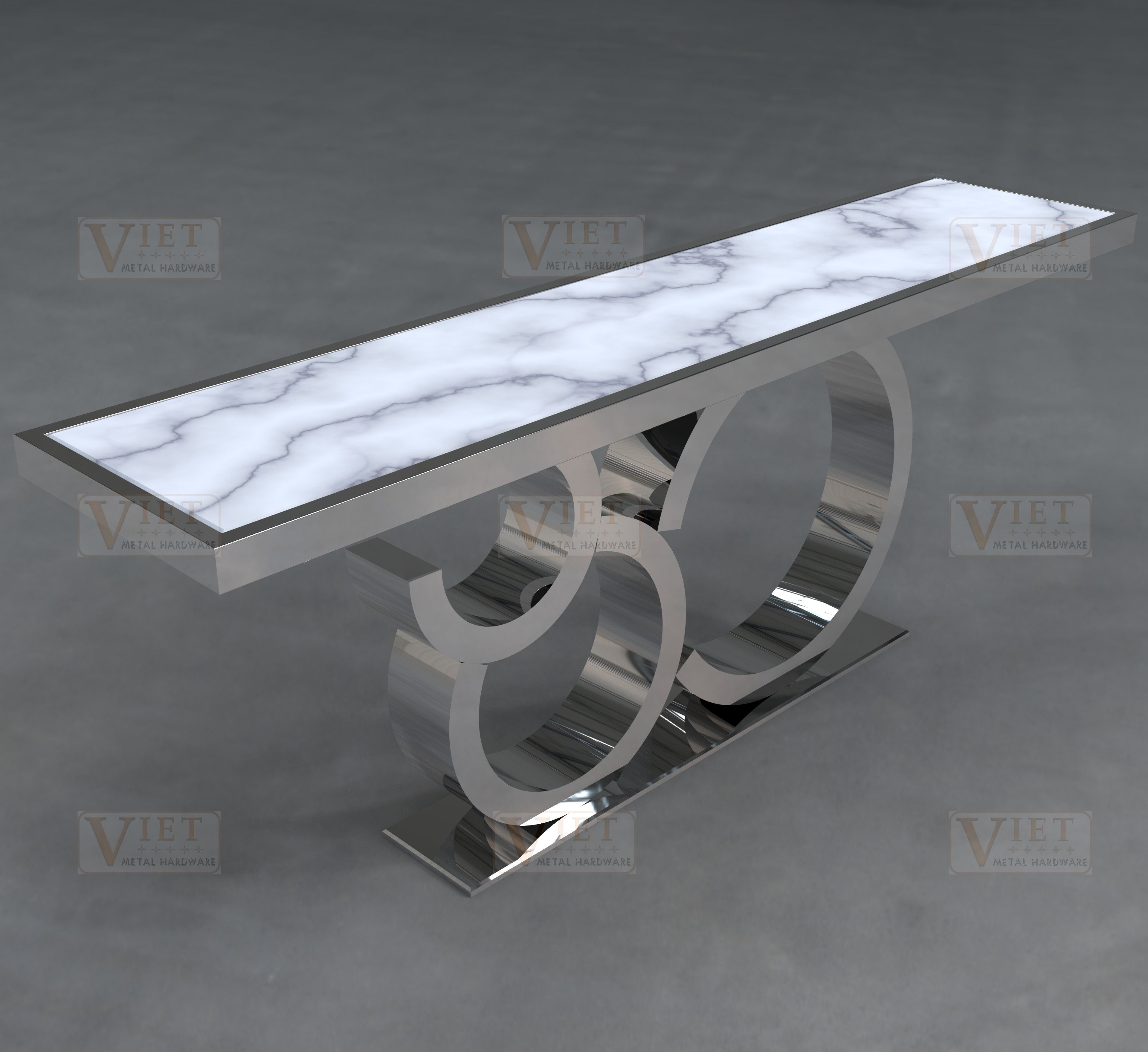 Bàn console C-Infinity Trio mang phong cách hiện đại với thiết kế lấy cảm hứng từ biểu tượng vô cực. Phần chân bàn được tạo hình từ ba vòng kim loại uốn cong theo dạng chữ C, liên kết với nhau như một chuỗi liên tục, gợi cảm giác chuyển động nhẹ nhàng và sự kết nối liền mạch.