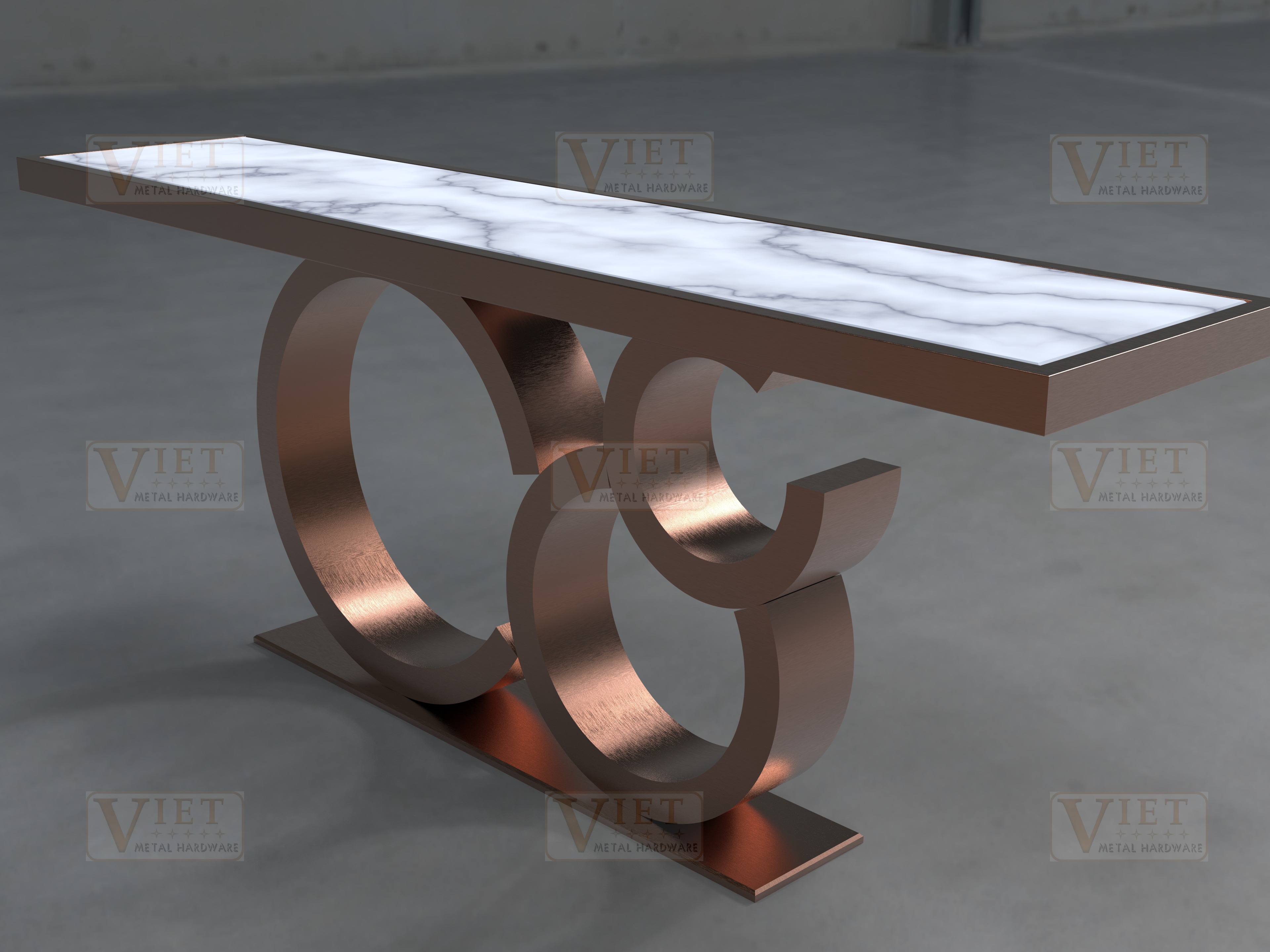 The C-Infinity Trio Console Table features a modern design inspired by the infinity symbol. Its base consists of three interconnected C-shaped metal curves, forming a continuous and flowing structure that adds a sense of harmony and elegance.